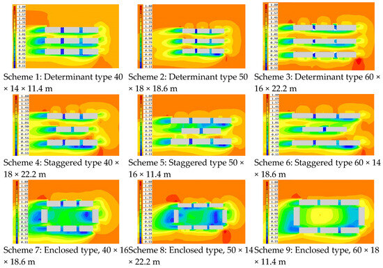 Figure 5 presents the CFD-simulated wind flow patterns under nine orthogonal design schemes, including determinant, staggered, and enclosed layouts with varying building dimensions. The comparative visualization of airflow distribution allows for intuitive evaluation of how different morphological parameters affect the near-ground wind environment. This figure serves as a key reference for supporting the analysis of wind environment characteristics across the tested configurations.