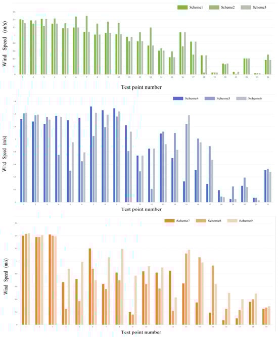 As shown in Figure 7, the wind speed values at each simulated measurement point reflect the influence of building layout and size on wind speed. Generally, the wind speed on the windward face of buildings is relatively high, while the wind speed on the leeward face and between the gable walls of adjacent buildings is relatively low. In the determinant layout (Schemes 1–3), the wind speed distribution is uniform, and the wind speed on the windward face increases slightly as building width increases. In the staggered layout (Schemes 4–6), the overall wind speed is relatively high, especially on the leeward face and between the gable walls of adjacent buildings. As building height and length increase, wind speed is enhanced. The enclosed layout (Schemes 7–9) results in the lowest wind speed, which could result in inadequate ventilation. In general, building schemes with larger scale and width lead to higher wind speeds, while enclosed layouts tend to cause low wind speeds and insufficient ventilation.