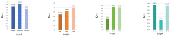 Based on the average wind speed values, the statistical parameters K, Kavg, and R are calculated, as presented in Table 9. According to the magnitude of R, the factors influencing wind speed are ranked as follows: building width > building length > layout form > building height. Therefore, in the planning and design of multi-story buildings, building width should be the primary consideration, followed by building length and layout form, with building height having relatively little impact on the outdoor wind environment.