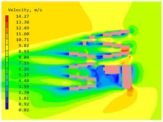 As shown in Table 2, the prevailing wind direction in Xi’an during both summer and winter originates from the northeast. Although seasonal variations in wind speed are observed, the overall characteristics of the outdoor wind environment remain consistent across seasons. Therefore, for the purpose of analysis, this study takes the summer condition as a representative scenario. The simulation results at a pedestrian height of 1.5 m are analyzed for the selected case building, as illustrated in Figure 1.