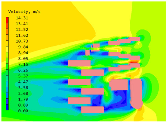 The staggered layout is a core design strategy in this study, aimed at reducing direct convective obstruction between buildings through the staggered arrangement [51]. This layout prevents buildings from facing the wind directly by disrupting potential wind speed dead zones that may form between them. As a result, it not only mitigates the risk of excessively high or stagnant wind speeds but also significantly enhances airflow smoothness [52]. Consequently, the wind speed distribution within the dormitory area becomes more uniform, and airflow is more continuous, leading to a substantial improvement in ventilation efficiency.