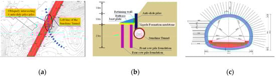 Sunshine tunnel left-line project: (a) Tunnel obliquely intersecting six anti-slide piles; (b) typical cross-sectional relationship between the tunnel and anti-slide piles; (c) sunshine tunnel section.