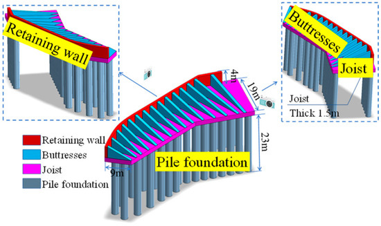 To ensure the safe excavation of the tunnel, the existing buttressed pile foundation beam retaining wall was improved, and a new buttressed pile foundation beam retaining wall suitable for this project was proposed to ensure the smooth progress of tunnel construction. The buttressed pile foundation beam retaining wall consists of four parts: the beam slab, retaining wall, buttress, and pile foundation. The maximum plane length is 54 m, and the maximum width is 22 m. The width of the buttress is 1 m, the width of the retaining wall is also 1 m, the thickness of the beam slab is 1.5 m, the diameter of the pile foundation is 2.5 m, and the length of the pile is 23 m. The three-dimensional effect of the buttressed pile foundation beam retaining wall is shown in Figure 2.