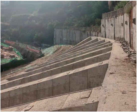 In slope disaster management, the construction of retaining walls is one of the commonly used methods for slope disaster prevention. The pile–beam retaining wall, an improved version of the traditional retaining wall, is widely applied in slope reinforcement in mountainous areas due to its advantages such as good stability and strong anti-sliding capacity. The pile–beam retaining wall is mainly suitable for locations requiring high stability, a large bearing capacity, and excellent seismic performance, such as (1) areas with unstable soil, gentle terrain, or requiring significant earthmoving; (2) embankments on steep slopes, with riverbank erosion, with unstable overburden adjacent to existing lines, or on deep bedrock; and (3) locations with insufficient foundation-bearing capacity or inadequate foundation depth.