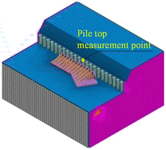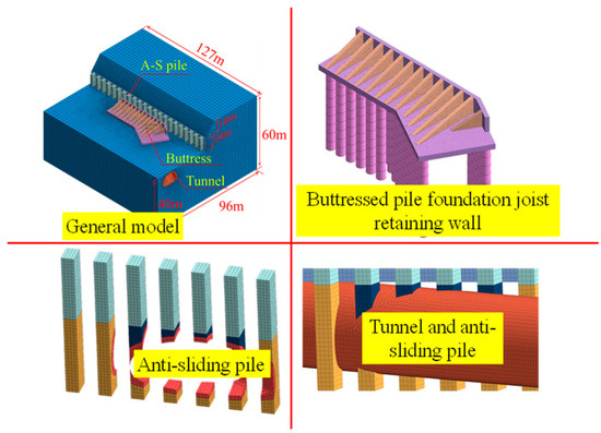 To improve the computational efficiency, the pile foundations were simplified as 1D beam elements. Anti-slide piles, tunnels, beam slabs, buttress ribs, retaining walls, and other concrete structural materials were modeled using 3D solid elements.