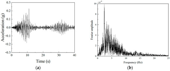 Wolong seismic waves: (a) Seismic wave time history curve; (b) Fourier amplitude spectrum of seismic waves.