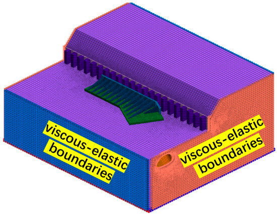 In this dynamic analysis, viscous–elastic boundaries based on the Lysmer–Kuhlemayer wave absorption theory were applied to both lateral sides of the model, effectively suppressing over 90% of boundary wave reflections through impedance-matching coefficients. The validity of this approach was confirmed by prior shaking-table tests conducted by the research group, while the model base was assigned a fixed boundary. The free-field boundary conditions in MIDAS GTS NX 2018 R1(64bit) finite element software were utilized to implement viscous–elastic boundaries around the model, with viscous parameters assigned via absorbing boundaries (see Figure 6 for numerical boundary configuration). A time step of 0.005 s was adopted to satisfy the stability criteria for explicit dynamic analysis.