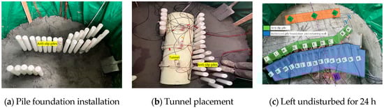 The tunnel lining was simulated using gypsum powder and water, with embedded steel mesh to simulate the tunnel’s reinforcement and steel arches. The density of the model lining was 1950 kg/m3, the elastic modulus was 1020 MPa, and the compressive strength was 0.5 MPa. Polyethylene plastic was used to simulate the buttressed pile foundation beam retaining wall and anti-slide piles, which met the scaled elastic modulus of C35 concrete.