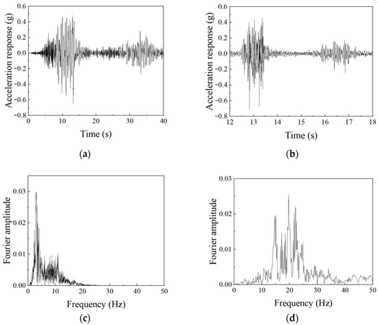 Comparison of pile head acceleration responses: (a) simulation of pile head acceleration response; (b) experimental pile head acceleration response; (c) Fourier amplitude spectrum of simulated pile head; (d) Fourier amplitude spectrum of experimental pile head.