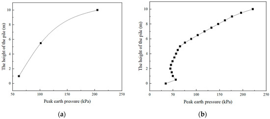 Figure 10 shows the peak earth pressure data behind the anti-slide piles obtained from numerical simulations and shaking-table tests. As can be seen in Figure 10, the peak earth pressure behind the anti-slide piles in both the numerical simulation and the shaking-table test exhibits a roughly triangular distribution, with higher earth pressure at the top and gradually decreasing earth pressure toward the bottom. At the pile bottom, due to the greater depth, there is still some embedment effect, resulting in a partial rebound in the peak earth pressure at the pile bottom. The distribution curve of earth pressure behind the anti-slide piles in the numerical model is generally consistent with the trend observed in the shaking-table test.
