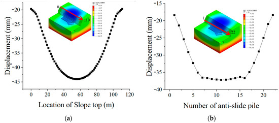 Displacement distribution for different beam slab length models: (a) slope crest displacement; (b) pile top displacement.