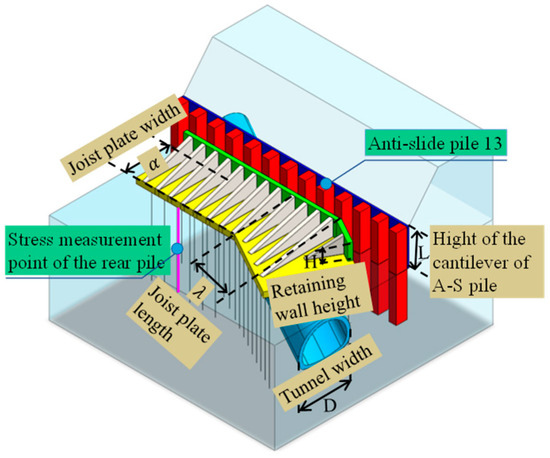 Taking into account the reinforcement effect [25], structural stress characteristics, and economic efficiency of the buttressed pile–beam retaining wall under different parameters, the optimal parameters are determined as follows: the length of the transfer beam slab should be one times the tunnel diameter extended at the intersection of the tunnel and slope, the width of the transfer beam slab should be 3.0 times the height of the retaining wall, and the height of the retaining wall should be 0.6 times the cantilever length of the anti-slide pile. Additionally, referencing other studies [1], it is recommended that the horizontal and longitudinal clear spacing of the piles be twice the pile diameter and the thickness of the transfer beam slab be two-thirds of the pile clear spacing.