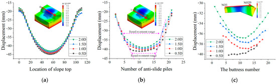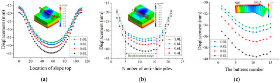Displacement extremes for different beam slab length models: (a) slope crest displacement; (b) pile top displacement; (c) displacement of buttress ribs.