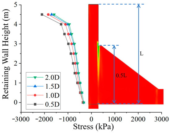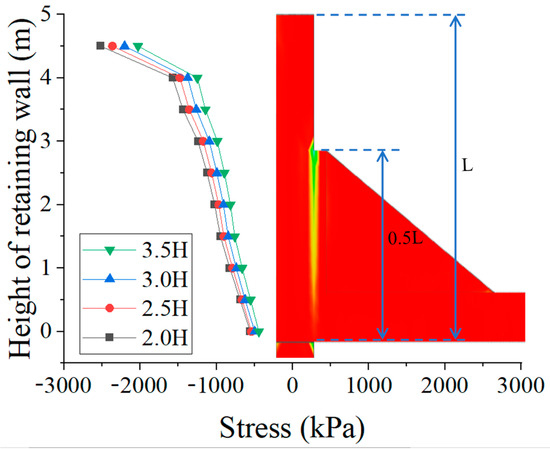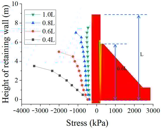 Figure 18 shows the stress distribution at the retaining wall for different retaining wall heights. The design height of the retaining wall affects the stress distribution pattern. When the design height of the retaining wall is less than 1.0 L, the maximum stress occurs at the top of the retaining wall; when the design height equals 1.0 L, the stress at the top of the retaining wall is the minimum.