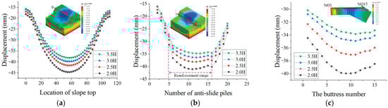 Figure 15 illustrates the distribution of extreme displacement values at the slope crest, pile top, and buttress for different widths of the transfer beam slab. As shown in Figure 15a, when the width of the transfer beam slab increases from 2.0 H to 2.5 H, the extreme horizontal displacement at the slope crest decreases by nearly 5 mm ± 0.1 mm. However, the effectiveness of the slope support gradually diminishes with further increases in width. Additionally, the increase in width does not alter the distribution pattern of the horizontal displacement curves at the slope crest and pile top. As depicted in Figure 15b, there is a clear distinction in the horizontal displacement at the pile top between slopes reinforced with buttressed pile–beam retaining walls and those without such reinforcement.