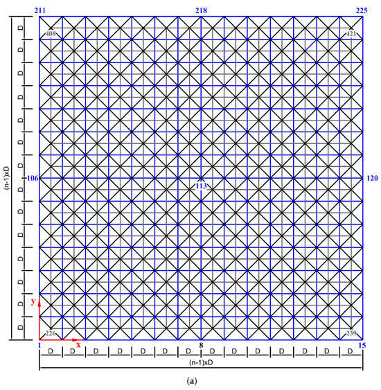 The coefficient matrix inherently contains information about the structural system’s behavior, including self-stress states () and mechanism modes (). Here, and indicate statically determinate and indeterminate systems, respectively, while and represent kinematically determinate and indeterminate systems, respectively. The structural behavior can thus be classified into four types based on the combination of s and m: (1) , , (2) , , (3) , , and (4) , . In general, trusses are designed to be kinematically determinate systems with , while structures such as cable nets and tensegrities often exhibit . Each of these modes can be extracted via the Singular Value Decomposition (SVD) of the coefficient matrix :