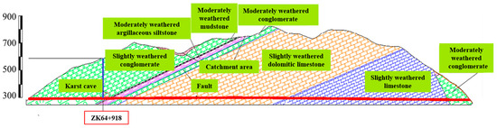 With a maximum depth of 485.2 m, the Shangjiawan tunnel is situated on the Xiangyang segment of the Bao-Yi Expressway. Limestone is the primary component of the surrounding rock, with karst, fractures, and groundwater in some sections. There are many karst depressions at the tunnel site, which is a special high-risk karst tunnel. Figure 2 illustrates the geological distribution of the Shangjiawan tunnel’s longitudinal section.
