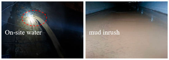 Advance drilling has been carried out at the left line of ZK64+918. There was a sudden increase in water volume during the drilling procedure, with a flow rate of around 200 m3/h. During excavation, a high volume of muddy water was released from the working area. In a very short period, the amount of mud gushing reached 7700 m3, and the muddy water rapidly poured out of the hole, flooding the tunnel invert 50 cm deep. Figure 3 displays the situation. After exploring, a water-filled karst cave was identified ahead of the face and was classified as a potential disaster source.
