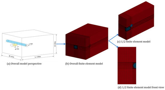 The tunnel structure and the geological conditions of the working area were modeled with a scale ratio of 1:20, as shown in Figure 4. Considering the symmetric geometry of the tunnel, only half the domain was modeled. The left and right planes of the model were assigned symmetric boundary conditions. The top surface was modeled as a free surface to allow blast-induced expansion, while the bottom surface was fixed in all directions. Non-reflecting boundaries were used at the far-field surfaces to prevent wave reflection artifacts. The whole model comprised four components, which were calculated using the multiple material arbitrary Lagrangian–Eulerian algorithm: fluid, air, explosive, and rock. The size of the calculated domain was 100 m × 63 m × 60 m, and the diameter of the tunnel was 4 m. The explosive strip capsule was situated in the center of the model. Using the symmetrical characteristics of the structure, only half of the model was calculated to reduce the amount of calculation. The model material was represented using SOLID164 units. All the elements constituting the model were set to solid elements with eight nodes, and each element exhibited a regular hexahedron shape. The number of units and nodes were 128,839 and 139,232, respectively. During the modeling process, we compared the actual blasting data with the simulation results in order to achieve better modeling accuracy. However, due to the requirements of the construction company, the experimental data were not saved.