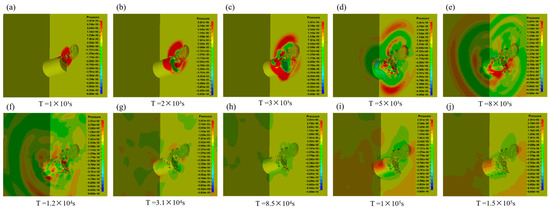 The evolutionary process of water inrush during drilling and blasting construction was visualized by the bursting pressure cloud picture (Figure 5). Attributed to the shock wave generated by the explosion, the stress of the rock mass adjacent to the blast hole instantaneously peaked. At the same time, radial cracks were observed at the edge of the crushed area due to the tensile stress reflected by the blasting stress wave. It can be deduced from the figure that the water-resisting rock mass was destroyed at 3000 μs, which further collapsed under the action of hydraulic erosion, and a water-conducting channel was initially formed and eventually induced water inrush.