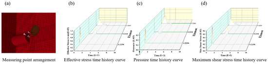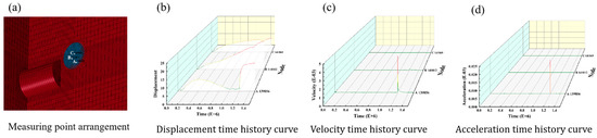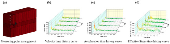 Four measuring points were selected on the outer wall of the wall rock of the remote tunnel to analyze the impact of explosions on the surrounding rock mass at different distances (Figure 6). This provides a basis for explaining the stress distribution and the extent of the blasting effect on the rock mass. Point A was closest to the blast hole and numbered 2660. Point B was numbered 26,286 and was located at 1/3 from the blast hole. Point C was numbered 26,301 and was located at 2/3 from the blast hole; Point D, designated by the number 26,316, was located at the edge of the model. The velocity, acceleration, and stress time history curves of each point are displayed in Figure 6b–d.