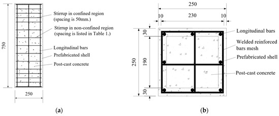 The ECC was prefabricated into a U-shaped permanent formwork with conventional concrete to form a composite beam. The composite beam’s shear capacity was improved, the crack speed slowed down, and the durability was further improved [10,11,12,13]. Other researchers used ECC material to prefabricate permanent formwork and form ECC/RC composite columns with post-cast concrete. The cracks of the composite column showed subtle and dense characteristics, and its horizontal bearing capacity, energy dissipation capacity, and deformation capacity were significantly improved [14,15,16]. Some researchers partially replaced concrete with ECC material to form composite beams in the tensile area at the bottom of the beam, and their crack resistance and bending performance were effectively improved [17,18,19]. The ECC prefabricated formwork provided good restraint for the composite column and enhanced the overall rigidity and peak strength of the composite column [20,21]. The load-carrying capacity of fully encased composite columns showed significant improvement, particularly in short columns. The enhancement was further amplified when the tie reinforcement spacing was reduced [22]. Researchers also used ECC materials to strengthen short concrete columns, investigating the confinement effects of different reinforced thicknesses. The ECC-reinforced short columns exhibited an increased load-bearing capacity, and the failure mechanism resembled that of stirrup-confined short columns, exhibiting similar crack patterns and ductile behavior [23]. The reinforced ECC prefabricated shell and post-cast concrete were used to form composite members in the precast monolithic structures, which can effectively improve their mechanical performance. The flexural bearing capacity was significantly improved, the crack development was effectively controlled, and the ECC material could delay the yield of the steel bars in the shell [24,25].