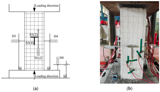 The strain of steel reinforcement was monitored by electrical strain gauges (120 Ω, 3 mm gauge length). The displacement meter D0 was placed to monitor the actual displacement values applied by the loading device. The vertical deformations of the middle region were monitored by displacement meters (D1~D2, measurement range: ±50 mm, resolution: 0.01 mm, accuracy: ±0.1%), as shown in Figure 3. The lateral deformations of the middle region were monitored by displacement meters (D3~D4, measurement range: ±50 mm, resolution: 0.01 mm, accuracy: ±0.1%). The strain gauges S1 and S2 (120 Ω, 60 mm gauge length) were also arranged in the middle of the column to monitor the transverse strain of the concrete and ECC material. The strain gauges S3 and S4 (120 Ω, 60 mm gauge length) were also arranged to monitor the longitudinal strain of the concrete and ECC material.