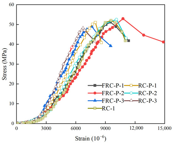 From the analysis of the specimens mentioned above, it can be observed that the RC precast shell composite columns exhibited typical diagonal crack-induced compression failure under axial compressive loading with severe damage, accompanied by significant concrete spalling and exposed reinforced bars. The columns exhibited brittle failure behavior. Even the conventional cast-in-place reinforced concrete specimen RC-1 showed diagonal crack failure, along with substantial concrete spalling and exposed reinforced bars. In contrast, the columns with R/ECC precast shells, due to the strain-hardening characteristics and superior deformation capacity of ECC material, provided additional confinement to the post-cast concrete inside the column. At the final failure stage, specimens FRC-P-1 and FRC-P-2 did not exhibit spalling of the ECC material, and the overall integrity of the specimens remained good. For specimen FRC-P-3, which had the lower stirrup ratio, the damage was more severe, only limited to the middle part of the specimen, with minor cracks appearing at the upper and lower regions of the column. Failure analysis revealed ductile characteristics in the R/ECC precast monolithic composite columns. Since the ECC material exhibited greater strain capacity at peak compressive stress compared with conventional concrete, the R/ECC precast shell ultimately developed transverse cracks due to the compressive failure of the post-cast concrete inside the column.