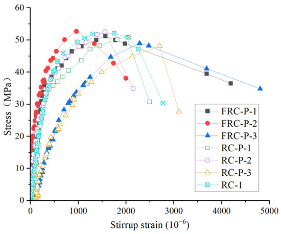 - When the load was less than 1000 kN, there was no significant difference in stirrup strain between specimen RC-P-2 and specimen FRC-P-2. From the load of 1000 kN to the peak load, the stirrup strain of specimen RC-P-2 began to exceed that of specimen FRC-P-2, and the difference gradually increased. Due to the high stirrup ratio of the two specimens, the stirrups of the two specimens did not yield at the ultimate load point. After that, the stirrup strain of specimen FRC-P-2 increased rapidly, and the curve declined more slowly than that of specimen RC-P-2.