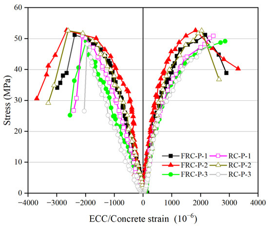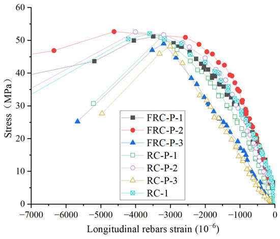 - Before the peak load point, the longitudinal reinforced bars’ strains in the composite column with the R/ECC prefabricated shell were lower than those in the RC counterpart at equivalent loading stages. When the stirrup ratio was relatively large, the longitudinal reinforcement strain value was quite different. The longitudinal strain difference between RC-P-3 and FRC-P-3, which had the smallest stirrup ratio, was relatively small, as shown in Figure 13. The ECC material delayed the yield time of the longitudinal reinforced bars. At equivalent longitudinal reinforcement strain levels, the R/ECC composite columns showed a 9.23% higher load-carrying capacity on average compared with RC counterparts. However, at the peak load, the corresponding strain of the longitudinal reinforced bars in the specimen FRC-P-1 was 6.68% larger than that of RC-P-1, the strain corresponding to the specimen FRC-P-2 was 15.21% larger than that of RC-P-2, and the strain of specimen FRC-P-3 was 6.18% larger than that corresponding to RC-P-3. The R/ECC composite columns exhibited better deformability than the RC composite columns. After the peak load, the curve decline of the R/ECC composite columns was slower compared with the RC prefabricated shell composite columns. This observation also showed that the volumetric stirrup ratio notably influenced the longitudinal reinforcement strain in R/ECC composite columns. It indicated effective cooperative behavior between the ECC precast shell and transverse reinforcement in providing complementary confinement.