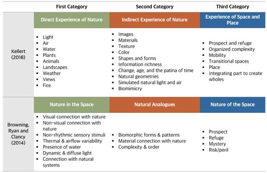 Key theoretical frameworks of biophilic design. Adapted from Kellert []; Browning, Ryan and Clancy [].