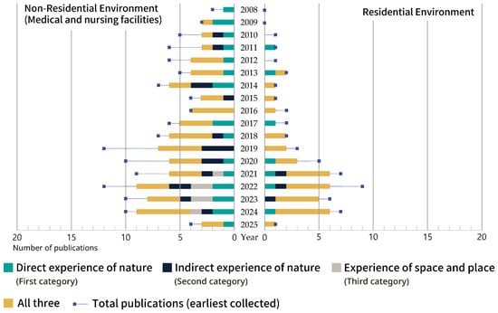 To examine current practices in biophilic design for seniors, this study conducted a literature review organized around the three experiential categories outlined in Figure 2. Between 2019 and 2023, research on biophilic design for seniors has grown noticeably, a trend that coincides with increased attention to indoor environmental quality in the wake of the COVID-19 pandemic [,]. Despite this growing interest, the majority of studies remain concentrated in healthcare and medical facility contexts. This indicates a notable gap in research addressing biophilic interventions within senior residential environments. While the direct experience of nature remains a consistent area of scholarly attention, the experience of space and place, particularly in residential contexts, remains underexplored. Nonetheless, there has been a recent shift toward more integrated approaches that encompass all three biophilic dimensions. Recent studies emphasize that these three categories are not mutually exclusive but function as complementary components of a unified design approach []. In particular, designs that combine direct interaction with natural elements, sensory-oriented indirect cues, and spatial or contextual features tend to yield greater benefits for health and psychological well-being [,].