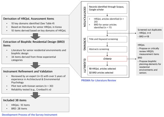 This study developed a structured survey instrument to assess HRQoL and preferences for BRD. The development process is summarized in Figure 3. The HRQoL section was constructed based on previous studies targeting Korean seniors and included 10 specific evaluation items. The BRD section was informed by the existing literature on senior-friendly housing and biophilic design, and items were categorized into three domains: direct experience of nature, indirect experience of nature, and experience of space and place. To ensure the validity of the instrument, the initial questionnaire was reviewed by five experts with over five years of experience in architectural design or environmental psychology.