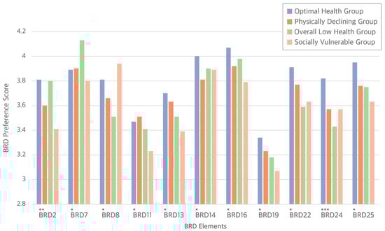Table 7 summarizes the group-wise mean scores and statistical results for all 28 BRD elements. To aid visual interpretation, Figure 4 highlights the average preference scores of the four senior clusters for the BRD elements that showed statistically significant differences. A total of 11 items showed statistically significant differences between groups (p < 0.05). These differences were most evident in elements related to sensory stability (e.g., BRD2: varied daylight angles), perceptual clarity (e.g., BRD24: nature-based wayfinding), and external connectivity (e.g., BRD22: balconies, BRD25: eco-friendly circulation paths). To aid practical interpretation beyond statistical significance, effect sizes (η2) were calculated for these elements using the ANOVA results. The η2 values ranged from 0.012 to 0.028, suggesting small but meaningful differences in preference patterns. Though modest, the observed effects reflect consistent patterns that support the value of interpreting BRD preferences through the lens of differentiated health profiles.