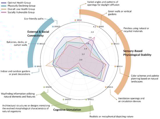 The Physically Declining Group expressed strong preferences for restorative and low-exertion features, such as BRD14 (natural colors) and BRD16 (ventilation systems). These results imply that design for this group should prioritize low-stress environments, such as calming visual palettes, ergonomic pathways, and passive environmental controls, to reduce physical fatigue while supporting sensory regulation.