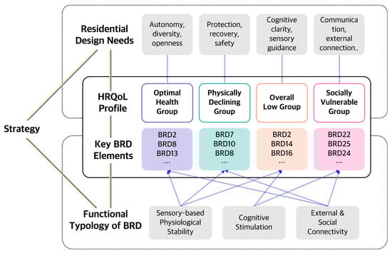 This study identified user clusters based on seniors’ HRQoL profiles and systematically linked their residential spatial needs to BRD elements, resulting in function-oriented design strategies. The conclusions aligned with the RQs are as follows: