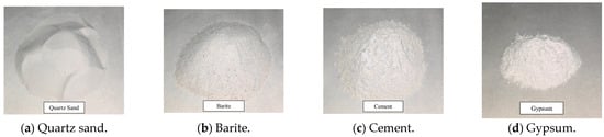To explore the relationship between the basic physical and mechanical parameters of similar fluid–solid coupled materials and the raw materials, quartz sand, barite, cement, and gypsum were selected for experimentation. Quartz sand with a particle size of 40–80 mesh and a fineness modulus of 2.33 was used. Barite, with a very-fine particle size of 2000 mesh provided high compatibility. P O 42.5 Portland cement was employed to regulate the strength of the materials, ensuring they would not disintegrate upon contact with water. Gypsum, conforming to the “GB/T 9776-2008” standard, was utilised to adjust the solid deformation and permeability of the material. Tap water from the laboratory was used. The main components of similar materials are illustrated in Figure 1.