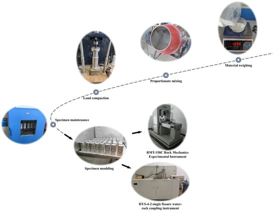 The process of making similar material specimens with a static pressure loading device was meticulously executed as follows. First, the aggregate and binder materials were accurately weighed by mass. These materials were then thoroughly mixed to ensure uniformity. Afterward, a specific mass ratio of water was added, and the mixture was stirred to achieve the desired consistency. A constant water-to-binder ratio of 0.4 was maintained across all mixes to isolate the effects of binder proportions. The prepared mixture was then placed into moulds and compacted in five stages to ensure uniformity between the top and bottom sections of each specimen. Once compacted, the specimens were demoulded and cured at room temperature for 10 days. Following the curing period, the specimens were ground into standard samples with a diameter of , in accordance with the “Regulations for Rock Tests in Hydraulic and Hydroelectric Engineering” (DLT5368-2007). Compressive strength testing was conducted using an RMT-150C rock mechanics testing instrument. Both uniaxial and triaxial compressive strength tests were performed with four confining pressures: 0 MPa, 1 MPa, 2 MPa, and 3 MPa. Initially, the method was switched to displacement control at a loading rate of , followed by a switch to displacement control at a loading rate of , where an axial load was steadily applied until the specimen failed. Hydraulic conductivity testing was performed using the HYS-4-2-type single-fracture hydro-rock coupling instrument. The confining pressure for the seepage tests was set between 0.3 and 0.5 MPa, as required by the equipment, with three different inlet pressures designed: 0.3 MPa, 0.6 MPa, and 0.9 MPa. The processes for configuring the similar materials and the test programs are depicted in Figure 2.