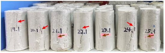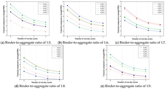 As the proportion of cement in the binder gradually increased, the deterioration of the uniaxial compressive strength of similar materials became less severe. Once set, cement forms hard hydration products that exhibit significant water resistance. In contrast, gypsum tends to decompose when immersed in water. Prolonged exposure to water can lead to the complete decomposition of gypsum, damaging its original structure and shape. Consequently, cement demonstrates superior water resistance. The pattern of changes in uniaxial compressive strength under different numbers of dry–wet cycles is illustrated in Figure 8.