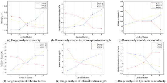 Table 3 and Figure 4a reveal that Factor C exhibited the largest range and variance, indicating the greatest data dispersion. Consequently, the cement–binder ratio had the most significant influence on the density of the similar materials, with a positive correlation observed between the sample density and the cement–binder ratio. Conversely, Factor B showed the smallest range and variance, indicating good data consistency and a minimal effect on the density of the similar materials. From the analysis of the trend line, a clear inverse relationship between the density of the similar materials and both Factors A and B emerged. This is because quartz sand has a relatively low density, whereas barite typically possesses a high density. Cement itself has a specific density, and its hydration products further increase the material’s density, thus exerting the greatest impact on the overall density of the similar materials.