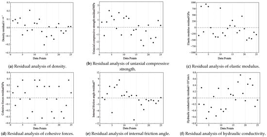 Utilising the equation established through multiple linear regression analysis for back-substitution testing, the fit between the predicted and actual data was notably high, with trends aligning closely. The absolute error in the density prediction results ranged from 0.003 to 0.154 , yielding an average error of 0.01 . For uniaxial compressive strength, the absolute error ranged from 0.005 to 2.001 MPa, with an average error of 0.002 MPa. The elastic modulus predictions showed absolute errors ranging from 5.684 to 166.806 GPa, averaging at 0.007 GPa. The cohesion prediction results had absolute errors ranging from 0.015 to 0.156 kPa, with an average error of 0.012 kPa. For the internal friction angle, the absolute error ranged from 0.321° to 8.132°, averaging 0.01°. Finally, the permeability coefficient predictions exhibited absolute errors ranging from 0.002 cm/s to 0.169 cm/s, with an average error of 0.004 cm/s. Generally, the errors for each factor satisfied the established requirements.