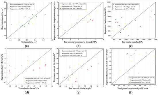 Multiple linear regression analysis. (a) Multiple linear regression analysis of density, (b) multiple linear regression analysis of uniaxial compressive strength, (c) multiple linear regression analysis of elastic modulus, (d) multiple linear regression analysis of cohesive forces, (e) multiple linear regression analysis of internal friction angle, and (f) multiple linear regression analysis of hydraulic conductivity.