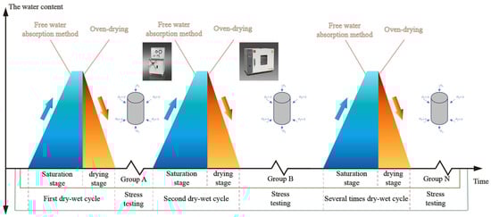 The dispatching pattern of the pumped-storage reservoir in Fuxin City, where the reservoir water level fluctuates between elevations of 70 m and 160 m, informed the experimental design. The midpoint of this fluctuation, at an elevation of 115 m, was taken as a reference for the dry–wet cycle duration of the rock mass. The indoor dry–wet cycle experiment was designed based on the anticipated annual soaking time of the rock body at a reservoir bank slope of 115 m, which is approximately between 170 and 195 days. Consequently, the dry–wet action time ratio for the rock body was established at approximately 1:0.87 and 1:1.15. For the indoor dry–wet cycle experiment, a 1:1 ratio was selected, with a dry cycle of one day followed by a soaking cycle of one day. Three dry–wet cycles were included in the design, with one set of samples tested for each cycle. The absence of disintegration throughout the dry–wet cycles indicates that the samples prepared with cement and gypsum as binders exhibit good hydrophobic properties.