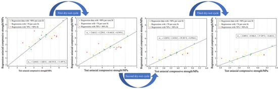 The R2 values ranging from 0.743 to 0.792 indicate that the multiple linear regression models explain 74.3% to 79.2% of the variance in uniaxial compressive strength under wet–dry cycles. These values are considered acceptable in geotechnical engineering due to the inherent variability in material properties and cyclic loading conditions []. After one dry–wet cycle, the absolute error in the predicted uniaxial compressive strength results ranged from 0.004 to 1.461 MPa, with an average error of 0.0018 MPa and a fitting confidence level of 84.3%. Following two dry–wet cycles, the absolute error ranged from 0.003 to 1.21 MPa, with an average error of 0.08 MPa and a fitting confidence level of 87.4%. After three dry–wet cycles, the absolute error was between 0.003 and 1.125 MPa, with an average error of 0.358 MPa and a fitting confidence level of 89.7%. The multivariate linear regression fitting function for uniaxial compressive strength under different numbers of dry–wet cycles is illustrated in Figure 9.