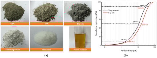 Raw materials and additives. (a) Morphology of materials; (b) particle size cumulative curve.