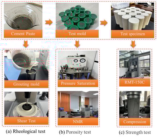 For different experimental protocols, two specimen configurations were employed: Rheological and structural performance tests utilized fresh cement grout specimens. Nuclear magnetic resonance (NMR) and mechanical strength tests employed standard cylindrical cured grouts (Φ50 × 100 mm).
