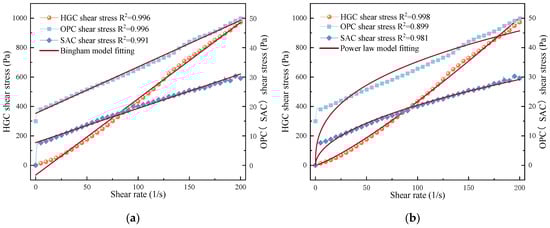 The rheological data of HGC, OPC, and SAC grouts across varying shear rates were modeled using Bingham and power-law formulations, with fitting curves illustrated in Figure 3. Key findings reveal the following: (1) For HGC grout at 0–50 s−1, the power-law model demonstrates superior fitting accuracy over the Bingham model. (2) Within 50–200 s−1, power-law modeling effectively describes HGC and SAC grout behavior, whereas the Bingham model better captures OPC grout’s rheological response.