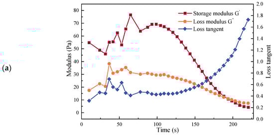Figure 4 presents the SAOS test results for the grouts. As shown in Figure 4, the HGC grout exhibits > during the 0–190 s period, indicating viscoelastic solid/gel-like behavior. After 65 s, both and gradually decrease with time. When the time exceeds 190 s, the relationship reverses ( < ), marking the transition from a viscoelastic solid to viscoelastic liquid state.