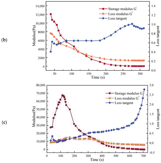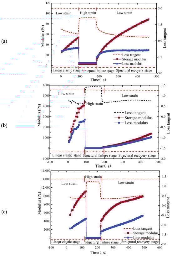 The thixotropy testing of grouts reflects their structural recovery characteristics during the complete process from stability to disturbance-induced failure and re-stabilization, as occurs in practical engineering scenarios such as roadway grouting under rock mass creep or mining-induced disturbances. As shown in Figure 5, all three grouts exhibit a gradually increasing storage modulus () and loss modulus () during the low-strain phase, with > indicating viscoelastic solid behavior within the linear elastic strain region. This demonstrates progressive strengthening of the internal grout structure over time, marking the transition from a gel state to solidification. During the high-strain phase, both and decrease rapidly under large-strain shear, reflecting breakdown of the flocculated structure and a transition to a viscoelastic liquid state. Upon strain reduction, and rebound quickly, with the system transitioning from a viscoelastic liquid ( < ) back to a viscoelastic solid ( > ) within a short duration, indicating re-gelation. The continued modulus increase signifies structural recovery toward a new equilibrium state through enhanced particle bonding and agglomeration.
