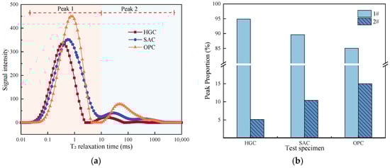 Figure 6 displays the T2 spectrum distribution of tested samples, where all cement stone specimens exhibit two characteristic peaks within the documented 0.01–1000 ms relaxation range [32]. The primary peak (0.1–5 ms) shows the maximum signal intensity, confirming micropore dominance, while the secondary peak (10–1000 ms) indicates limited macropore distribution. Figure 6 shows progressive rightward spectral peak shifts with intensified signals for HGC, SAC, and OPC samples, indicating gradual pore size enlargement. Quantified peak area proportions in Figure 6b reveal HGC’s dominant first peak (94.86%), substantially exceeding SAC (89.59%) and OPC (85.02%), confirming its superior fine pore concentration.